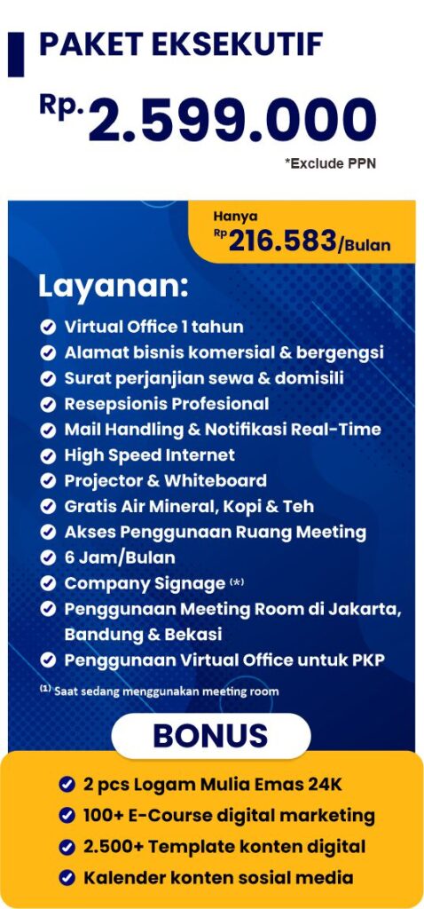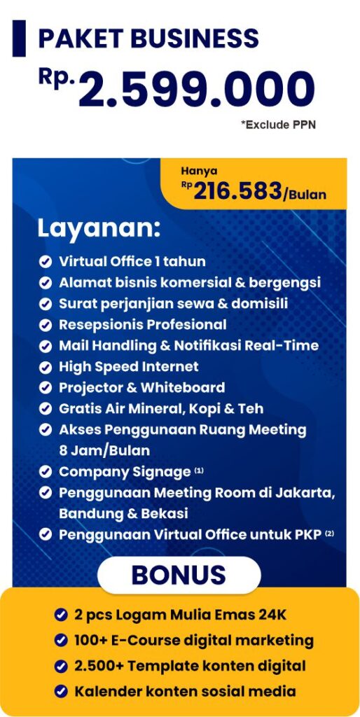 Solusi bisnis profesional dengan alamat prestisius, layanan resepsionis, serta fasilitas eksklusif untuk meningkatkan citra dan kepercayaan klien Anda