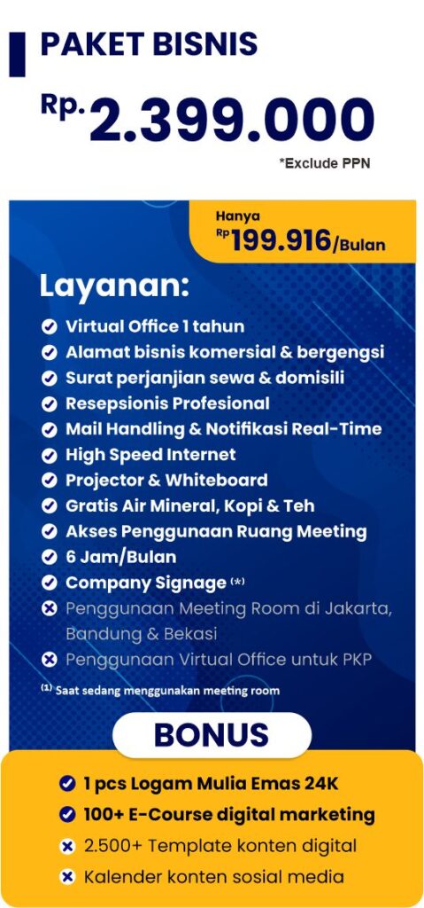 Dapatkan alamat bisnis prestisius dengan biaya terjangkau! Virtual office kami menawarkan fasilitas lengkap, layanan profesional, serta fleksibilitas tinggi.