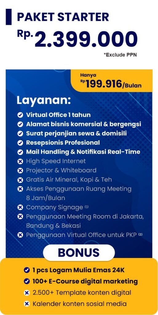 Dapatkan layanan Virtual Office dengan harga terjangkau tanpa mengorbankan kualitas! Nikmati fasilitas lengkap untuk mendukung bisnis Anda dengan biaya yang efisien